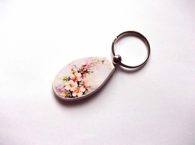 breloc pe lemn decorat cu tehnica decupaje ,pictat cu acrilice si lacuit cu lac ecologic