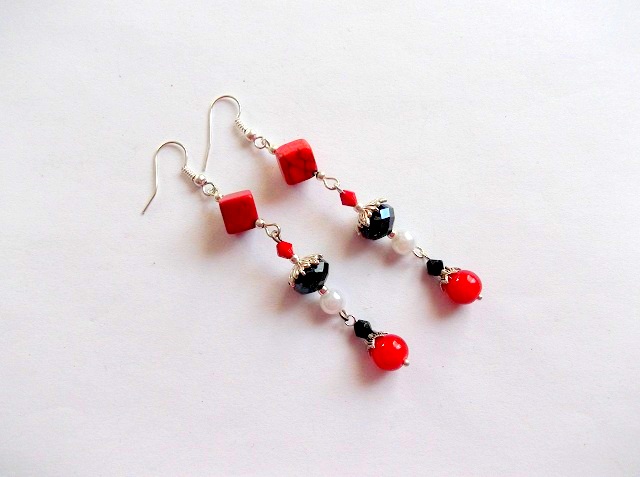 cercei howlite rosu  ( pietre semipretioase ), perle sticla si cristale