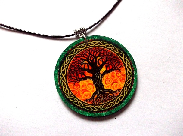 colier realizat cu tehnica decopaje pe lemn si lacuit cu lac ecologic diametrul pandantivului 50 mm