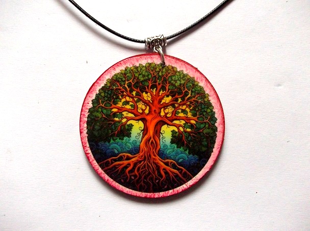 colier realizat cu tehnica decopaje pe lemn si lacuit cu lac ecologic diametrul pandantivului 50 mm