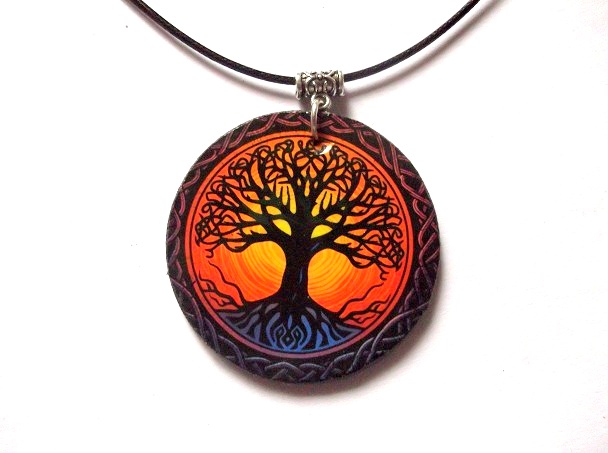 colier realizat cu tehnica decopaje pe lemn si lacuit cu lac ecologic diametrul pandantivului 50 mm