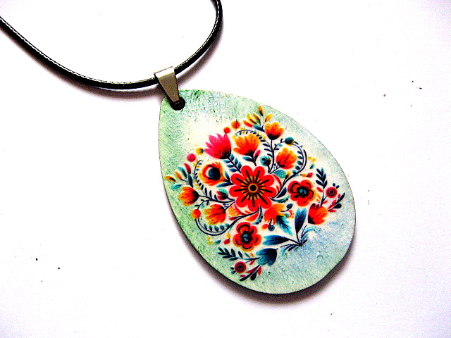 Colier realizat cu tehnica decopaje pe lemn si lacuit cu lac ecologic