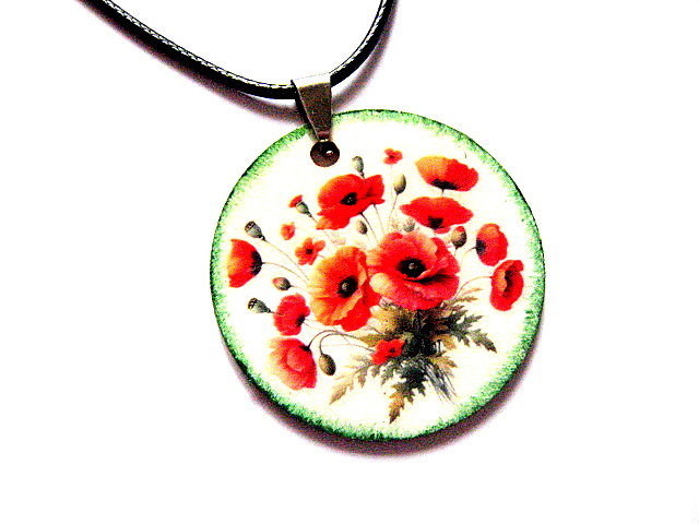 Colier realizat cu tehnica decopaje pe lemn si lacuit cu lac ecologic