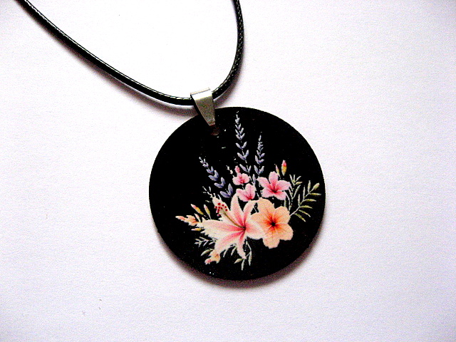 Colier realizat cu tehnica decopaje pe lemn si lacuit cu lac ecologic