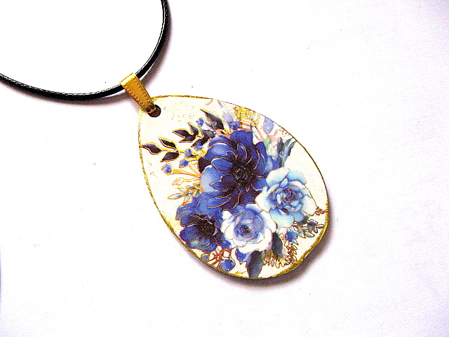Colier realizat cu tehnica decopaje pe lemn si lacuit cu lac ecologic