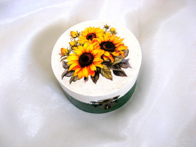 Cutie din lemn, de forma rotunda, decorat cu tehnica decopajului , pictat si lacuit cu lac ecologic
