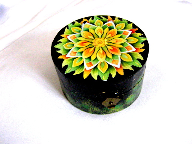 Cutie din lemn, de forma rotunda, decorat cu tehnica decopajului , pictat si lacuit cu lac ecologic
