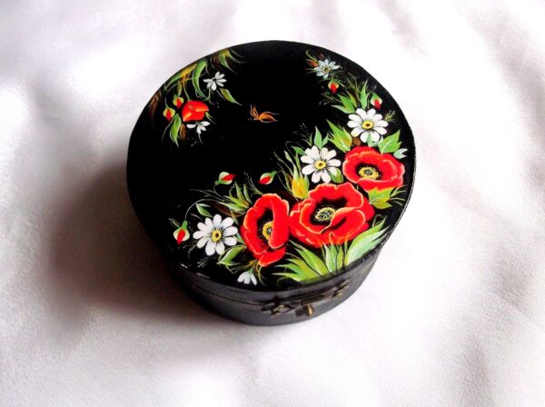 Cutie din lemn, de forma rotunda, decorat cu tehnica decopajului , pictat si lacuit cu lac ecologic