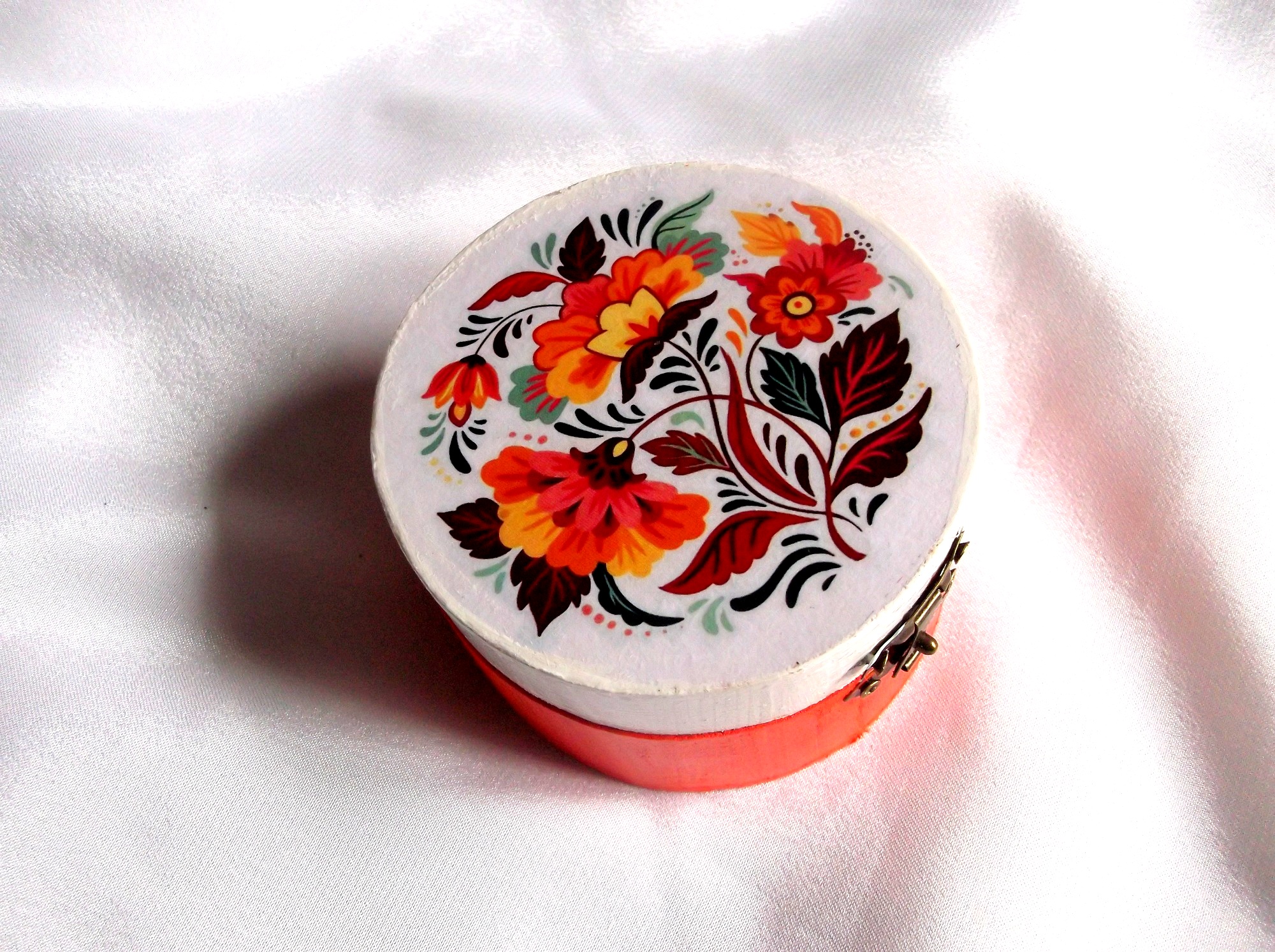 Cutie din lemn, de forma rotunda, decorat cu tehnica decopajului , pictat si lacuit cu lac ecologic