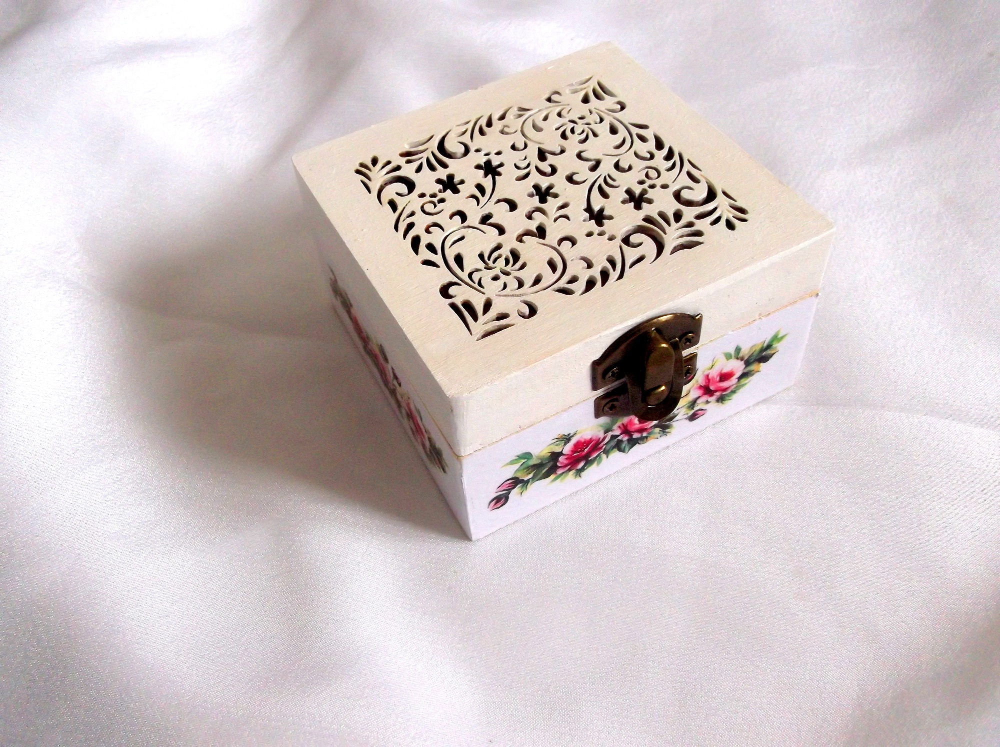 cutie lemn decorata cu tehnica decupajului , pictata si lacuita cu lac ecologic
