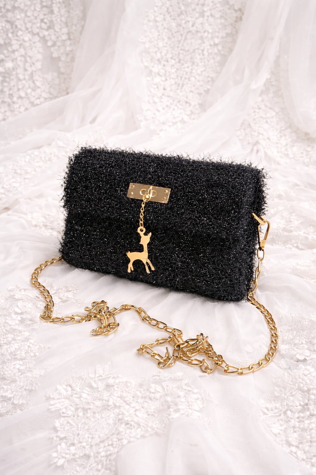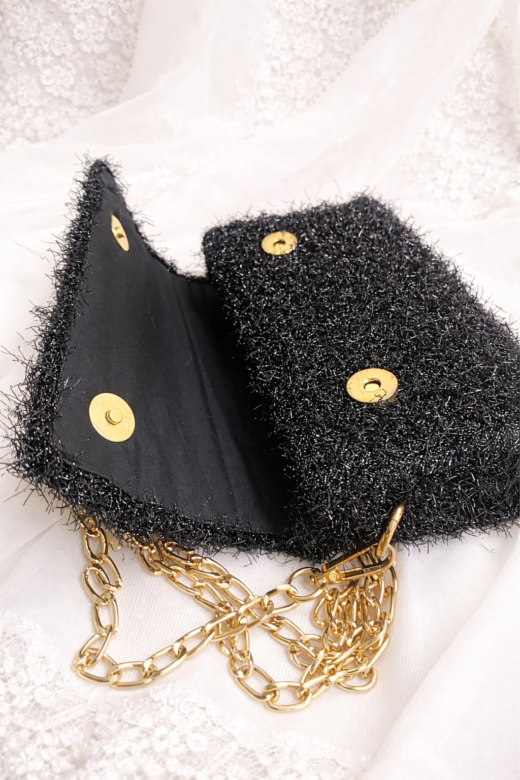 Poseta (geanta ) confectionata din plasa canvas cusuta cu fir de bumbac cu lurex accesorizata cu lant metalic . Interiorul este captusit cu material textil asortat .