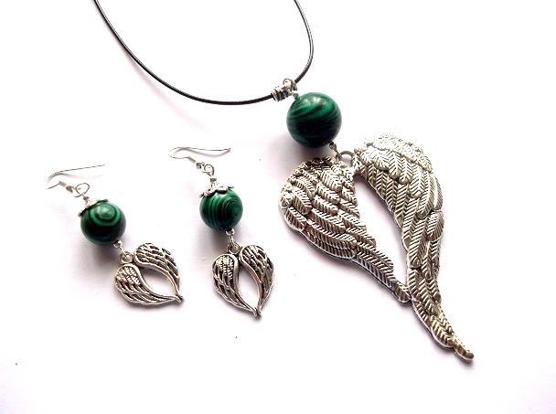 Set aripi ingerasi ,pandantiv si cercei cu malachit( pietre semipretioase )