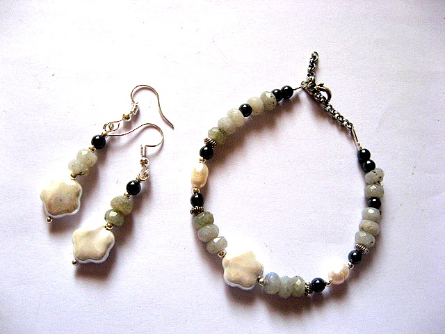 set bratara si cercei cu perle mallorca ,labradorit fatetat ,hematit ( pietre semipretioase ) si perle de cultura