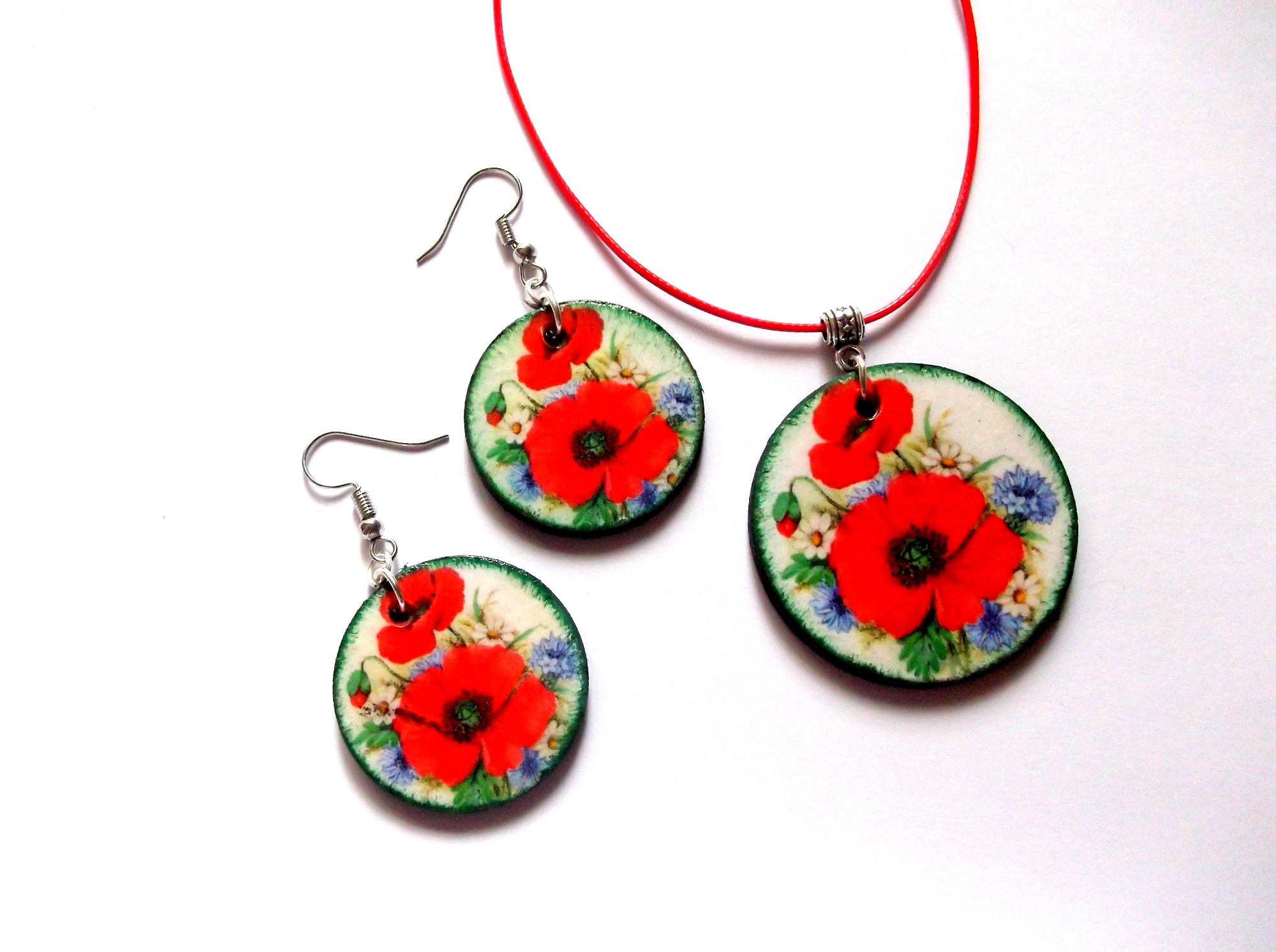 set colier si cercei realizat cu tehnica decopaje pe lemn si lacuit cu lac ecologic