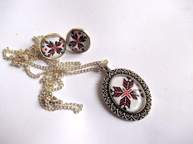 Set bijuterii pandantiv si cercei cu model traditional rosu cu negru31987