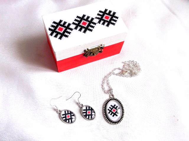 set cadou format din cutiuta decorata cu motiv traditional si set bijuterii cu motiv traditional