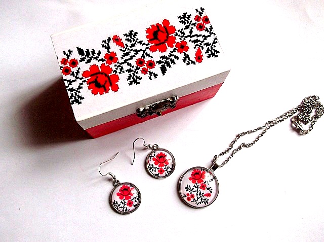 set cadou format din cutiuta decorata cu motiv traditional si set bijuterii cu motiv traditional