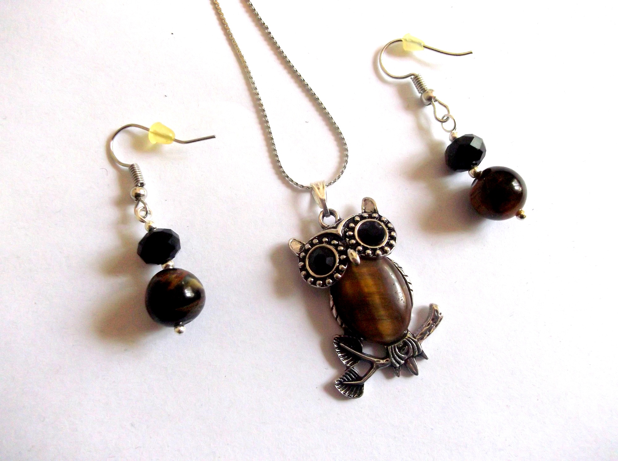 set colier bufnita si cercei cu ochi de tigru ( pietre semipretioase ) si cristale negre