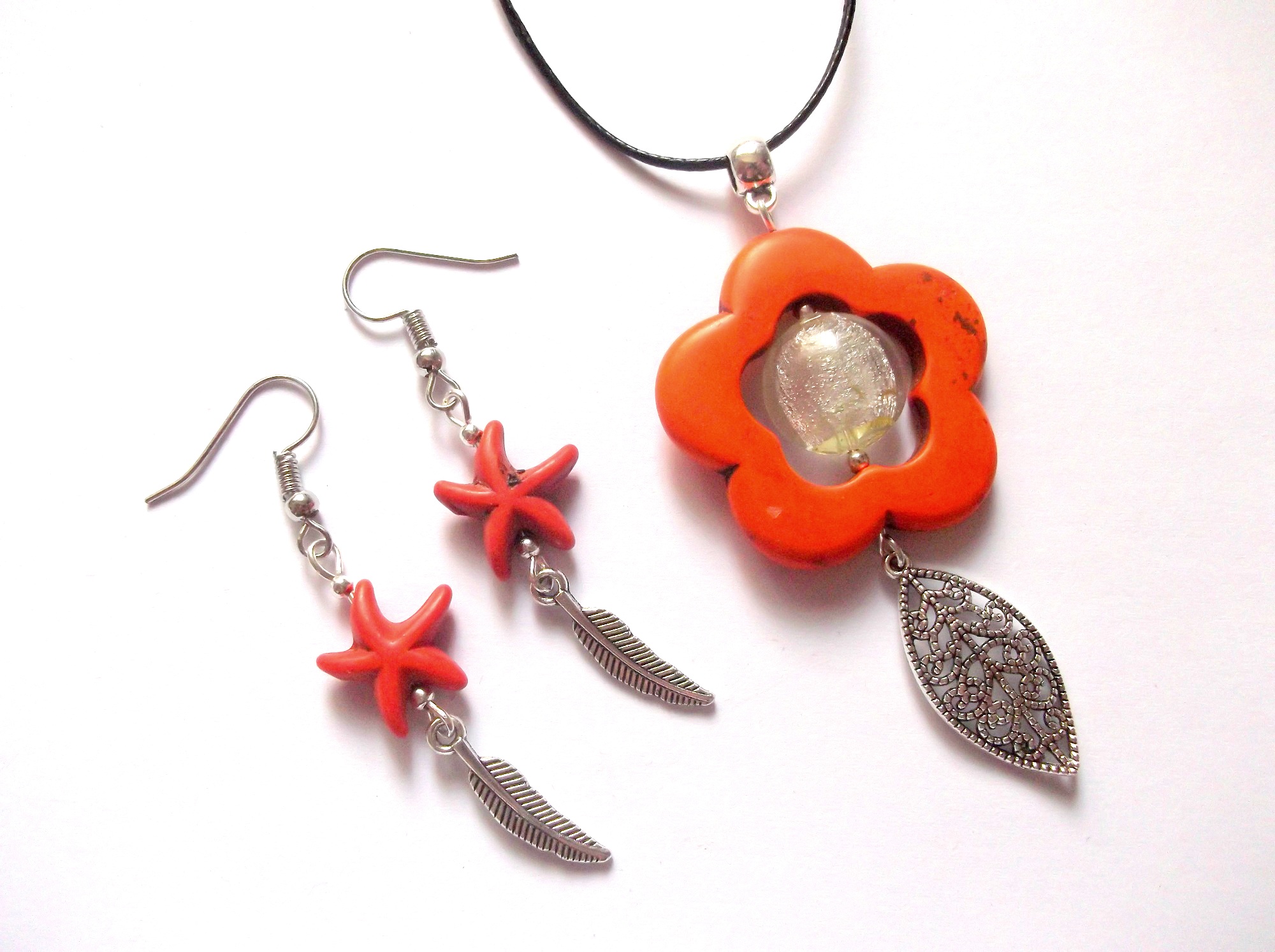 set colier si cercei cu howlite portocaliu ( pietre semipretioase ) si margea sticla murano