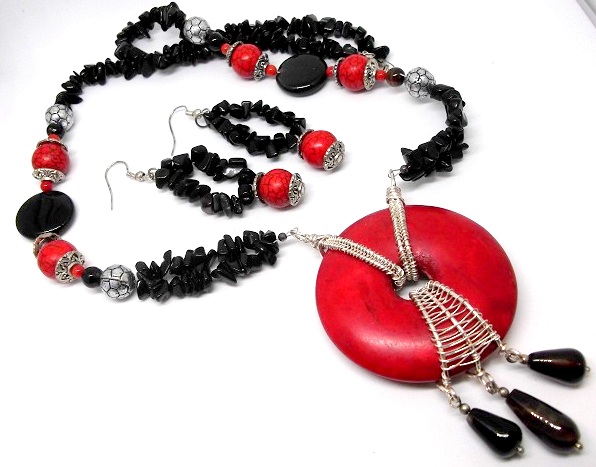 set colier si cercei cu howlite rosu si onix ( pietre semipretioase )