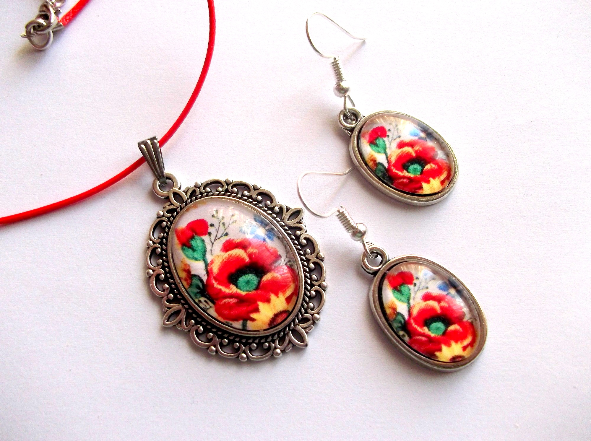 set pandantiv , si cercei cu sticla cu flori de maci